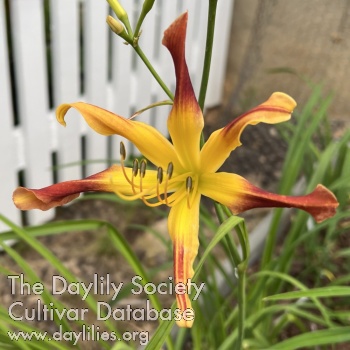 Tomato red bitone with lightly brushed stripes on sepals, and large, extended green to yellow throat.