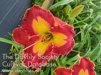 Red with shades of golden throat, slight ruffled gold edge.