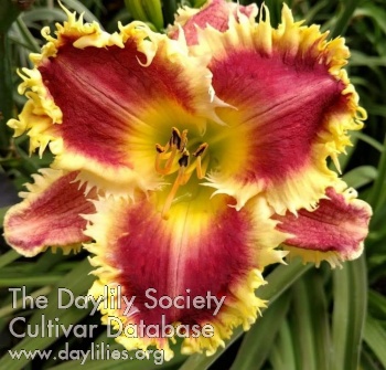 Orange red bitone with large yellow golden teeth outlining the petals and sepals, faint orange red eyezone above a green yellow throat.