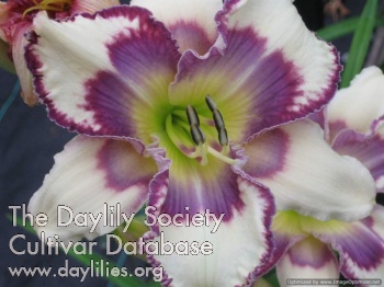 White with green throat, lavender blue eye surrounded by raspberry red, matching double edge, pod fertile, northern hardy.