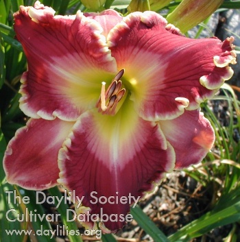 Rose red bitone, pink eye, pink and ivory edge, yellow to green throat.