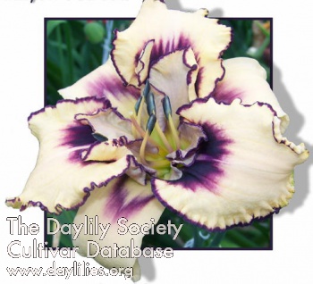 cream (RHS 19B) with yellow green throat, cream petalets extending from petals, dark purple (RHS 187A) eye and wire edge