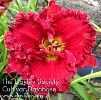 Medium red (RHS 46B) petals and sepals, slightly diffuse, darker (RHS 46A) eye, yellow green throat, three eighths inch, heavily ruffled edge.