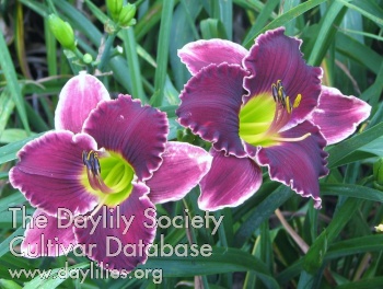 Red violet bitone with green throat and fine, white ruffled edge.