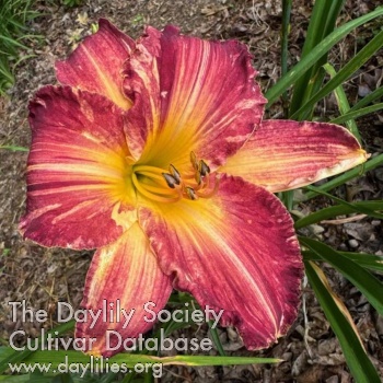 Mauve lavender with broken colors, striping and some splotches, and a yellow throat.