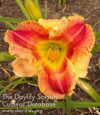 yellow orange, lighter petal edges with scarlet red flashings on petal centers, lighter broken patterned band outside the dark red eye, and yellow to green throat