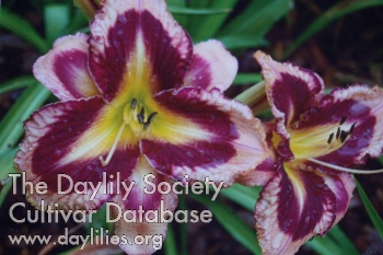 Silvery rose lavender with deep burgundy red veining, lime green to lemon yellow throat with white midribs into the deep burgundy red chevron, yellow and rose echo on sepals.