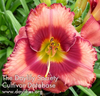 vibrant bold pink eye dominates, on a peach pink petal and small ruffled edge that echoes the eye color, above a yellow to green throat