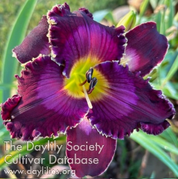 Deep, royal velvet purple, broad fuchsia watermark, deep yellow to lime throat, ruffled ivory petal and sepal edges, open form.