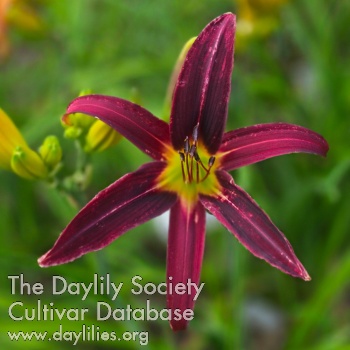 Black purple self with yellow green throat.