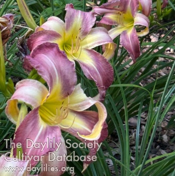 Lavender pink bitone with darker eye, yellow throat, and white midribs.