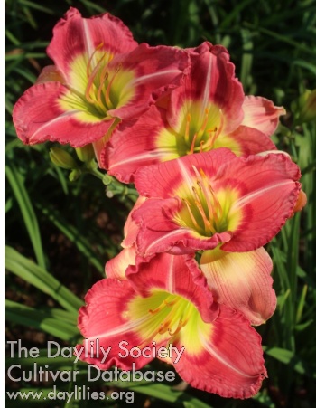 Deep pink bitone with large green throat, small white midribs on petals and lightly ruffled edges.