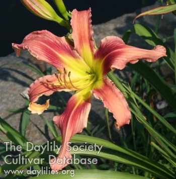 peach pink with medium rose band, contrasting rose veining on petals that matches band, green throat