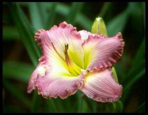 That portion of the daylily that flowers. It begins as a bud on a scape, and proceeds to grow until it reaches maturity. At maturity, it opens its tepals to expose the flower’s form, color, distinctive markings (eye, halo, edging, midribs, throat) and the sexual portions consisting of the pistil and stamens. An individual bloom generally opens for a single day, then withers, only to be succeeded by one or more new blooms until all the buds on a scape have matured. The spent bloom may or may not produce a pod from which seeds are harvested.