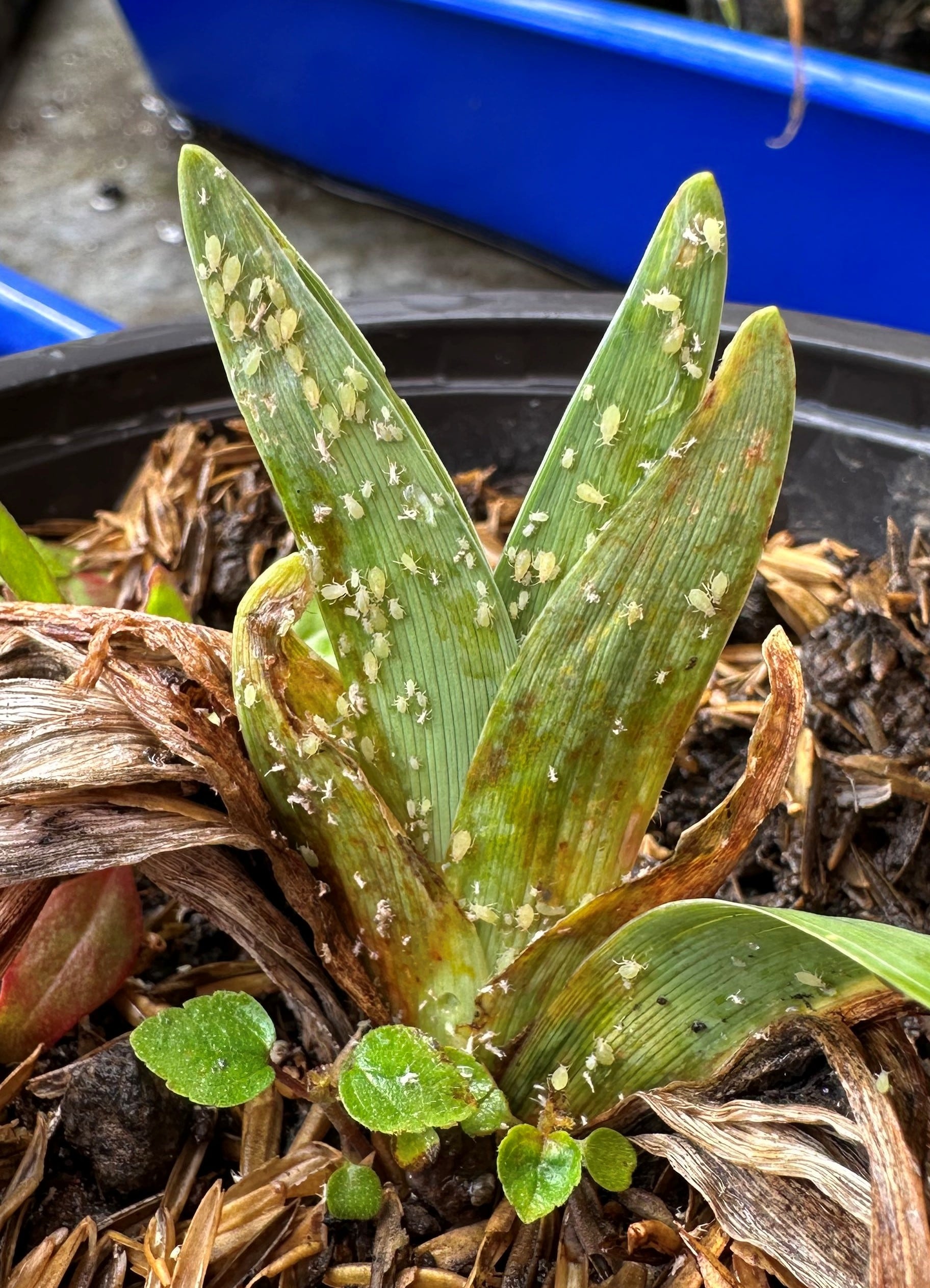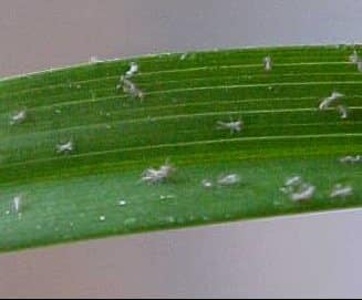 Aphids are small, mostly less then one tenth of an inch, soft-bodied insects of the family Aphididae. The daylily aphid, Myzus hemerocallis, is, not surprisingly, often found on daylilies but there are many other kinds of aphids; some of which may also affect daylilies from time to time. The daylily aphid is light green in color and feeds in colonies between the leaves of the plant, inserting the mouth parts into plant tissue and sucking up the juices. Whitish specks are often noticed on the plants when aphids are present. These are the cast skins left behind after molting. (See lower image below.) They also excrete a sticky substance called “honeydew”. The image accompanying this text is of the related green peach aphid (Myzus persicae). The life cycle of aphids can be rather complex and can vary somewhat according to species and geographical region. In mild weather aphids can produce continuous generations rapidly by live birth without mating, most of the population being female. With the imminent onset of cold weather in Fall, males may be produced, mating occurs and the females lay overwintering eggs. In warm climates and in greenhouses, some species may omit the egg-laying stage and continue to reproduce by live birth through the winter, although where it is slightly colder they may hibernate as adults. Most aphids are wingless, but sometimes you will see winged forms. Natural enemies may keep populations down to levels where no treatment is necessary. Aphids are especially partial to plants fertilized with large amounts of nitrogen. If control is desired, insecticidal soap can be effective if the aphids are located where they can be directly hit by the spray. Numerous other low or non-toxic remedies are discussed in various references including repellent companion plants such as the allium (onion) family, coriander and anise.