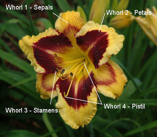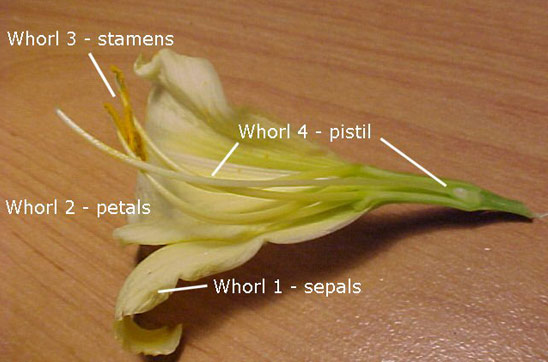 Daylily flower with some petals and sepals removed to show the four floral whorls. Frontal view below.