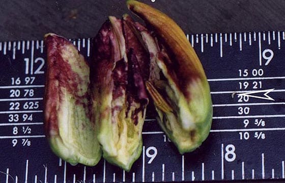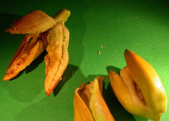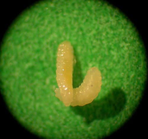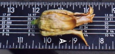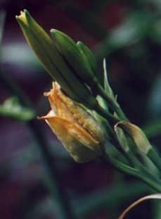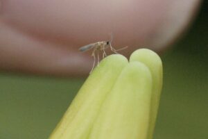 A very serious pest of daylilies which causes the buds to swell up and drop off before flowering. It can cause severe loss of flowers. This pest can be spread from one place to another in soil or potting mix with plants and also with budded scapes. The cause is Contarinia quinquenotata, a small fly which has been a pest of daylilies in Europe for several decades and was identified in British Columbia, Canada in the Summer of 2001. Since then it has crossed the border into the state of Washington and has recently been reported by AHS members in north-western Ontario and in Nova Scotia. In 2019 this pest was also reported to be in Maine. It is quite possibly in other unrecorded locations as well. Daylilies purchased unwashed with soil, in pots, or with intact budded scapes are more likely to introduce the pest to a new area than daylilies acquired bare-root and without visible scapes. The fly lays eggs in the flower buds. Maggots develop inside daylily flower buds causing them to become inflated, distorted and unable to open properly. Some buds may rot or dry up. Reports indicate that in some cases clumps may be so badly affected that few buds open normally. Early flowering daylilies are typically the most heavily infested and egg-laying may have ceased by the time later flowering daylilies are forming buds, allowing them to escape much of the damage. Infested buds may contain from one or two to as much as a hundred or more small white legless larvae up to around 0.12” (3 mm.) in length which, when sufficiently mature, fall to the ground where they overwinter. Thus far it appears this insect only has one generation each year. In spring they emerge as adults and fly to daylily buds to lay their eggs. Because they are inside the galled buds, larvae are protected from contact insecticides. Also, since the adults are flying for several weeks each season, it will be difficult to provide sufficiently continuous contact insecticide coverage to prevent egg-laying. Treatment involves removing affected buds as soon as it is obvious that they have been attacked. These buds must then be destroyed so that the maggots within them cannot continue their life cycle. Some gardeners destroy the maggots by burning the infested buds. Do not compost infested buds unless the larvae have already been killed by some means. Some gardeners use early flowering daylily cultivars particularly favored by the midges as “trap plants” to assist in collection of infested buds. To avoid bringing this pest into your locality, purchase plants bare-root and well-washed. Cut off all scapes before transporting, even if they do not appear to be obviously affected.