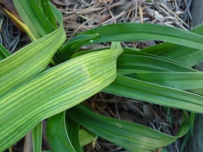 Interveinal chlorosis is a yellowing of the leaves between the veins with the veins remaining green. In plants with strap-like leaves such as the daylily this results in a striped effect. While there are several possible causes, this symptom frequently indicates a nutritional imbalance. The accompanying image illustrates a daylily exhibiting interveinal chlorosis. In this particular case, leaf tissue analysis indicated the cause was probably manganese deficiency induced by high soil pH.