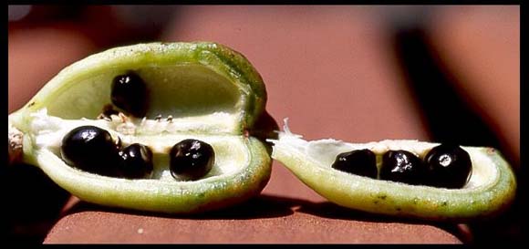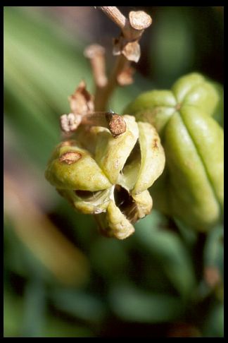 The fruit of the daylily in which seed develops and ripens. Technically, it is a “loculicidal capsule,” meaning that its walls become dry and then split when the seeds are ripe as shown below. Pods form if the flower has been fertilized. If you deadhead your plants, they will not form pods.