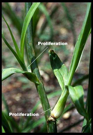 A leafy shoot from a node or bract found on scapes of many cultivars. Proliferations may be rooted to form a plant (clone) identical to the mother plant. Small roots often form and occasionally a flower is produced while the proliferation is still on the scape. In the image below the upper proliferation has formed at the bract.