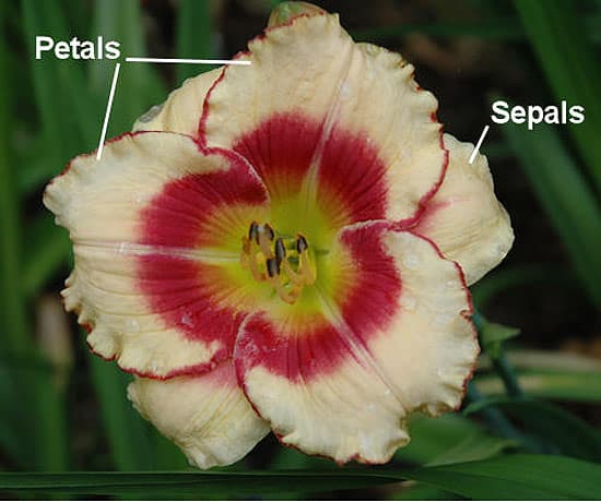 A typical (not double) daylily flower has six perianth segments arranged in two rows. The three inner ones are the petals, and the three outer ones are the sepals. The term “tepal” may be used to refer to any of the six, because they are relatively undifferentiated from each other as compared to many other plants, such as roses. Also see: Petal, Sepal, Polymerous.