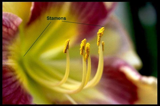 Each typical flower has six stamens attached at the base of the petals. Each stamen has a stalk called the filament that ends with a two-lobed anther filled with dust-like yellow pollen. The pollen is haploid and contains the sperm cells. Also see: Anther, Filament, Haploid, Petals.