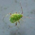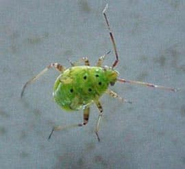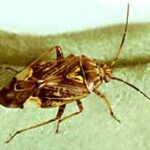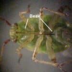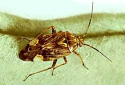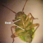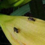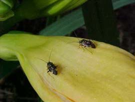 Lygus lineolaris occurs throughout North America. (The Tarnished Plant Bug in Europe is Lygus rugulipennis, this family of bugs often being known there as capsid bugs). Lygus lineolaris is around a quarter inch in length; the adult is often seen on or in daylily flowers and on leaves, frequently ducking underneath the bloom or leaf rapidly when approached. While the adult is usually yellowish brown with an obvious triangle shape on its back, the young nymphs are green and resemble aphids when small except that they move much more quickly. The adults overwinter under leaves and other garden debris, stones or bark. They emerge early in spring on warmer days and are active in the garden into the fall. Eggs are inserted into plant tissue. There are three to five generations a year, and in the south they may be active year round. TPB’s are damaging to a wide range of plants including agricultural crops and vegetables as well as ornamentals; they feed by inserting a beak into the plant tissues, injecting a toxin, and sucking up the plant juices. While the extent of the damage they do to daylilies is uncertain, in other plants their feeding can result in injury to flower buds, causing them to abort and drop, or the blooms not to open properly. Seed pods may be attacked, causing seeds to shrivel or be non-viable, and younger pods may drop. Feeding on other plant parts may result in distortion, stunting and dieback. The adults are highly mobile, which makes them difficult to control. TPB’s are particularly partial to alfalfa, and after this is cut for hay will often then move into neighboring gardens to find alternative food. They also tend to be more of a problem in dry years. Clean up leaves and other garden debris in the fall to remove overwintering places. Control weeds which can provide food and hiding places. If necessary, spray with insecticidal soap early in the morning when the bugs are still sluggish from the cooler temperatures.