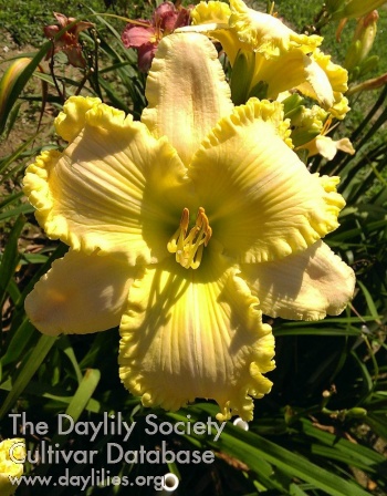 Cream yellow self, heavily ruffled gold edge, yellow green throat, diamond dusting on petals.