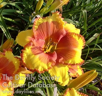 Glowing primary yellow petals with a rosy peach mango eye and picotee edge, and small, yellow green throat.